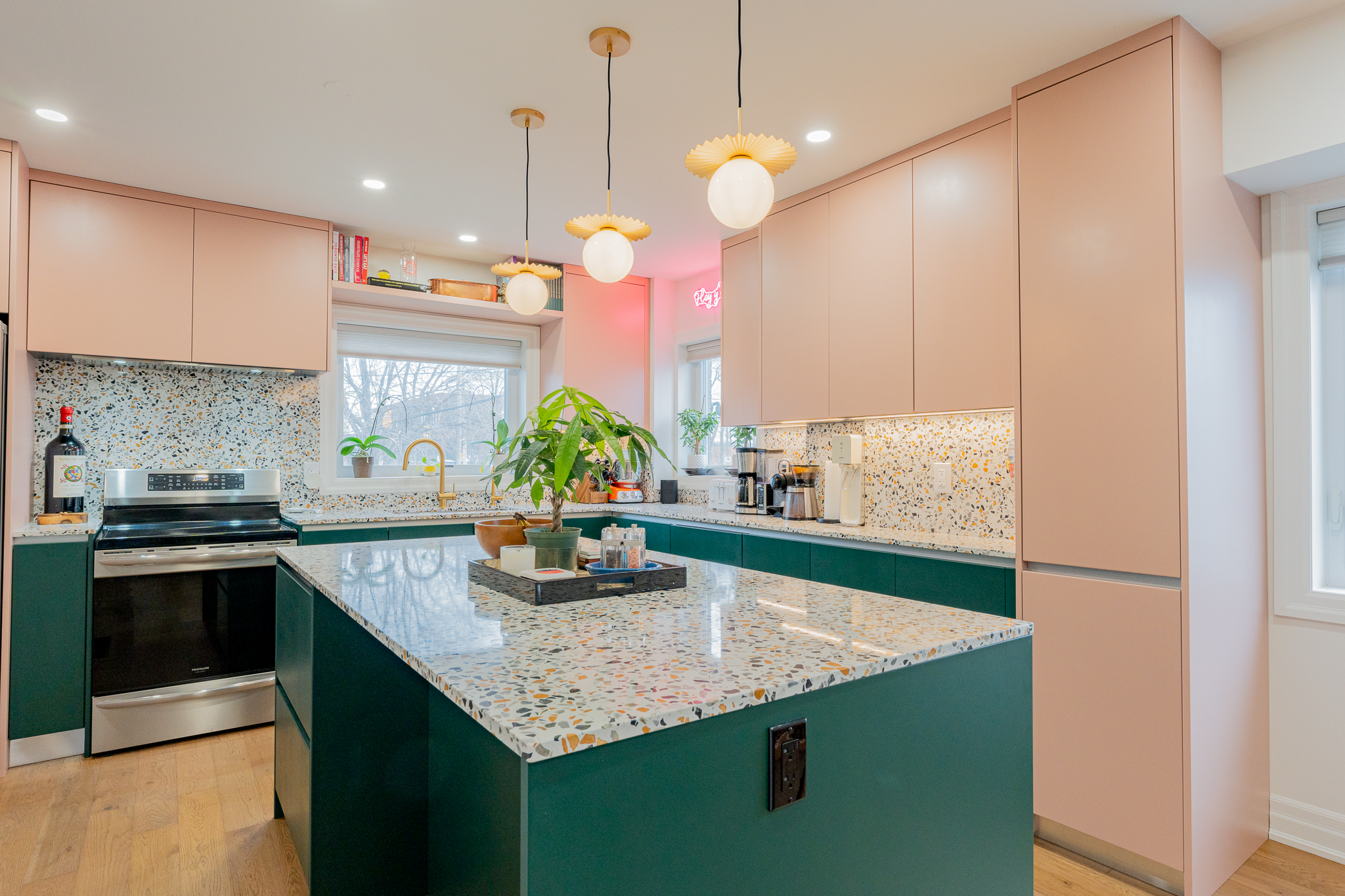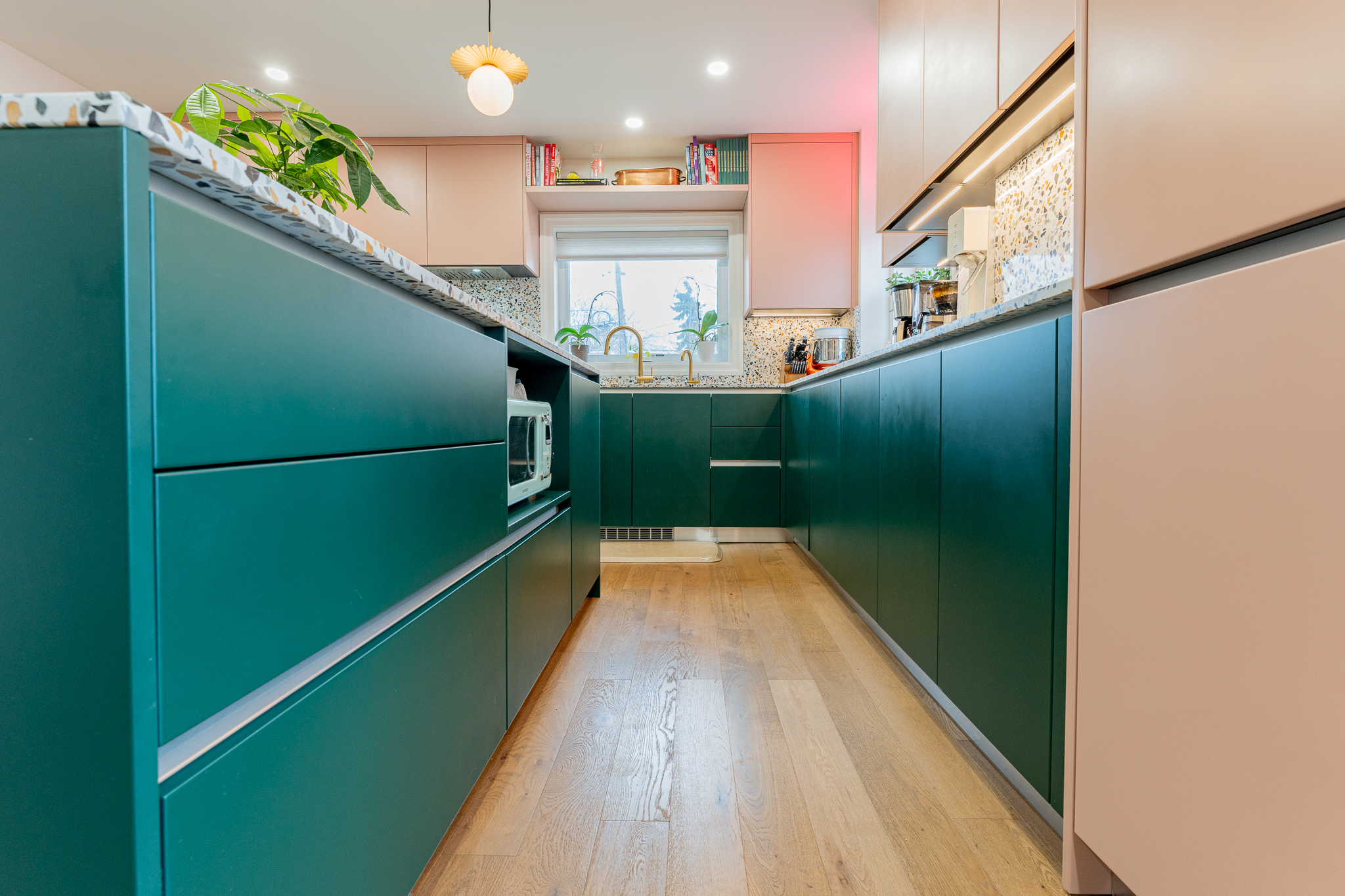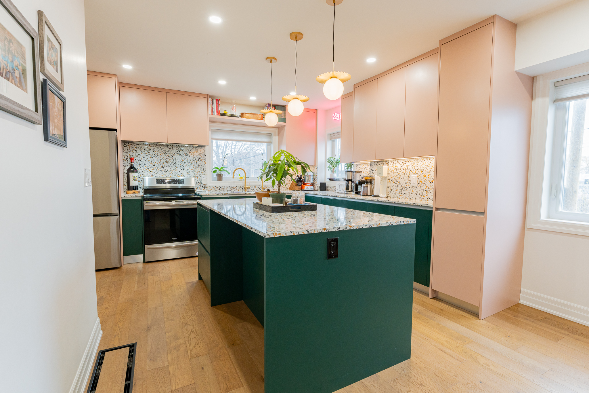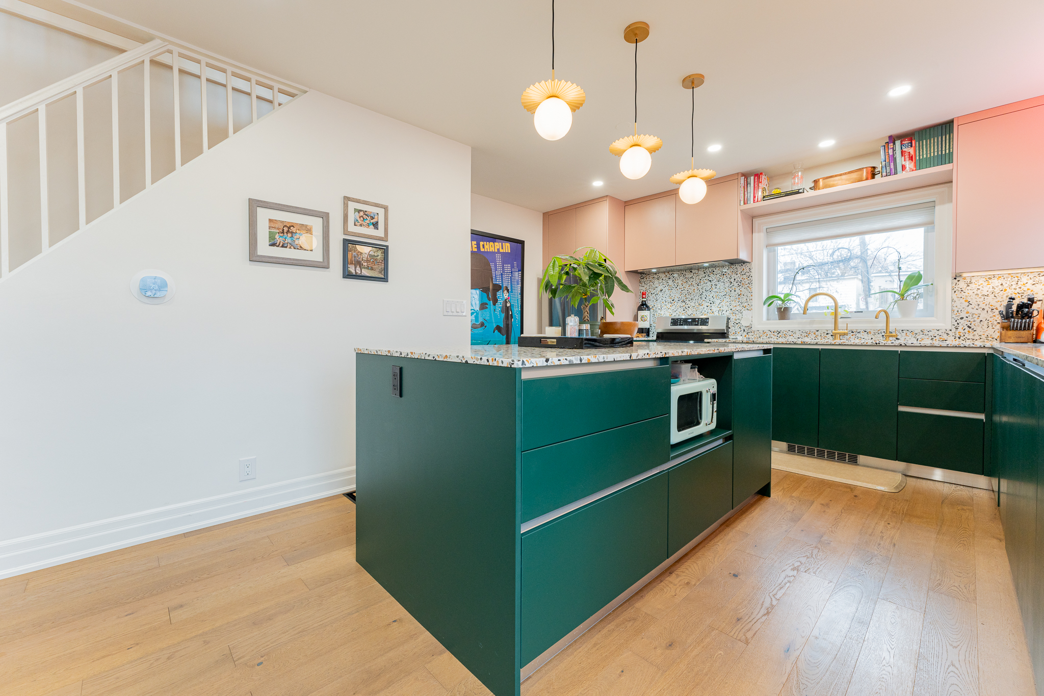 This main floor and basement renovation highlights Norseman Construction’s ability to completely transform a home with thoughtful design and quality craftsmanship. The layout was reimagined to improve flow, functionality, and everyday living. At the heart of the main floor, the kitchen makes a bold yet balanced statement. A deep green island, soft blush cabinetry, and terrazzo countertops bring texture and personality, while gold accents and modern lighting add a refined touch. The result is a space that feels both distinctive and highly functional. The basement was redesigned as a seamless extension of the home — bright, welcoming, and intentionally planned to maximize comfort and usability. This project reflects our commitment to creating spaces that are tailored, timeless, and built around the way our clients live.