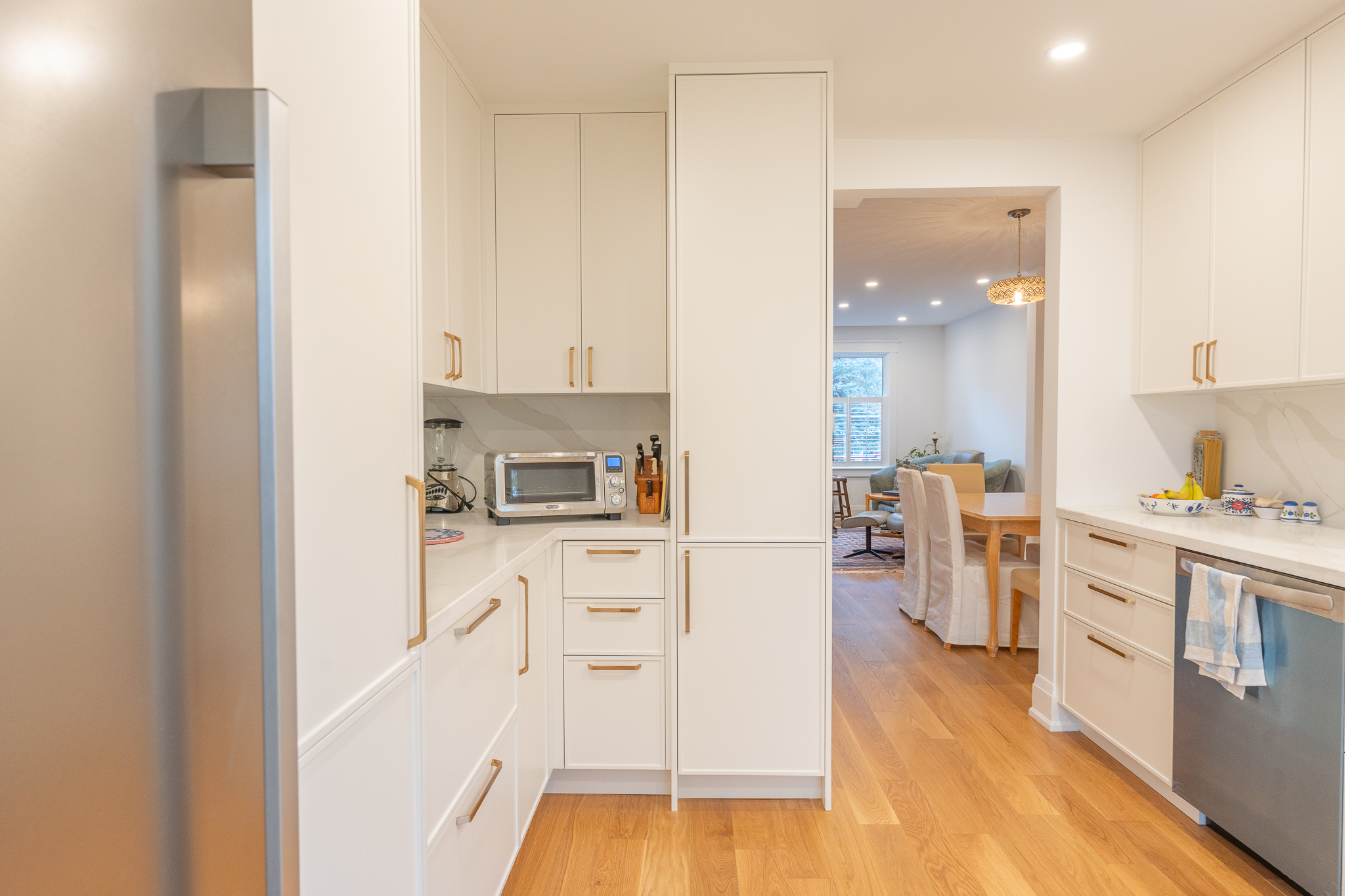 This main floor renovation features a custom white kitchen as the heart of the home, brought to life through a seamless collaboration between our architects, interior designers, and construction team. The space feels bright and fresh, with every detail carefully planned to create a functional, stylish, and welcoming home.